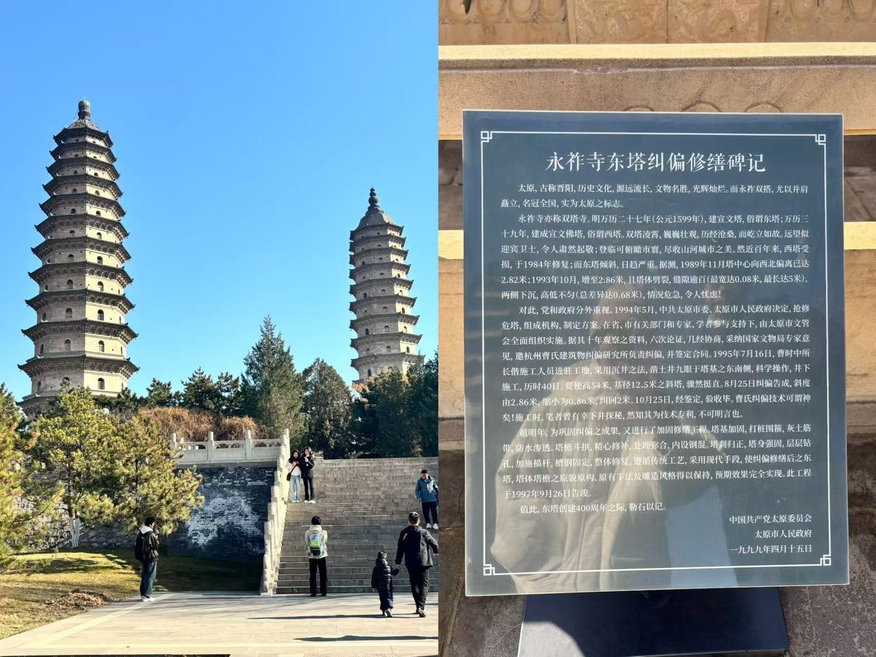 不仅如此,我还发现了中国自己的斜塔,那就是双塔中的文峰塔(图中右侧塔,原名宣文塔即东塔),你是否观察到它往左偏了一点点呢?(看太阳照射的塔身明线对比左侧塔非常明显!),附上拍到的纠偏碑记(博主和对象双双入镜):